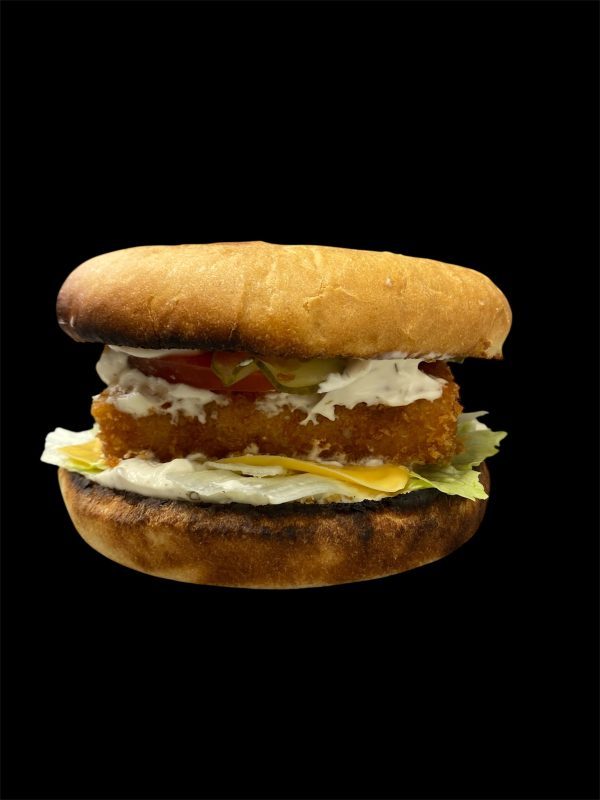 Зерновая булочка, соус тартар, филе трески, листья салата, сыр чеддер, помидор, маринованные огурчики