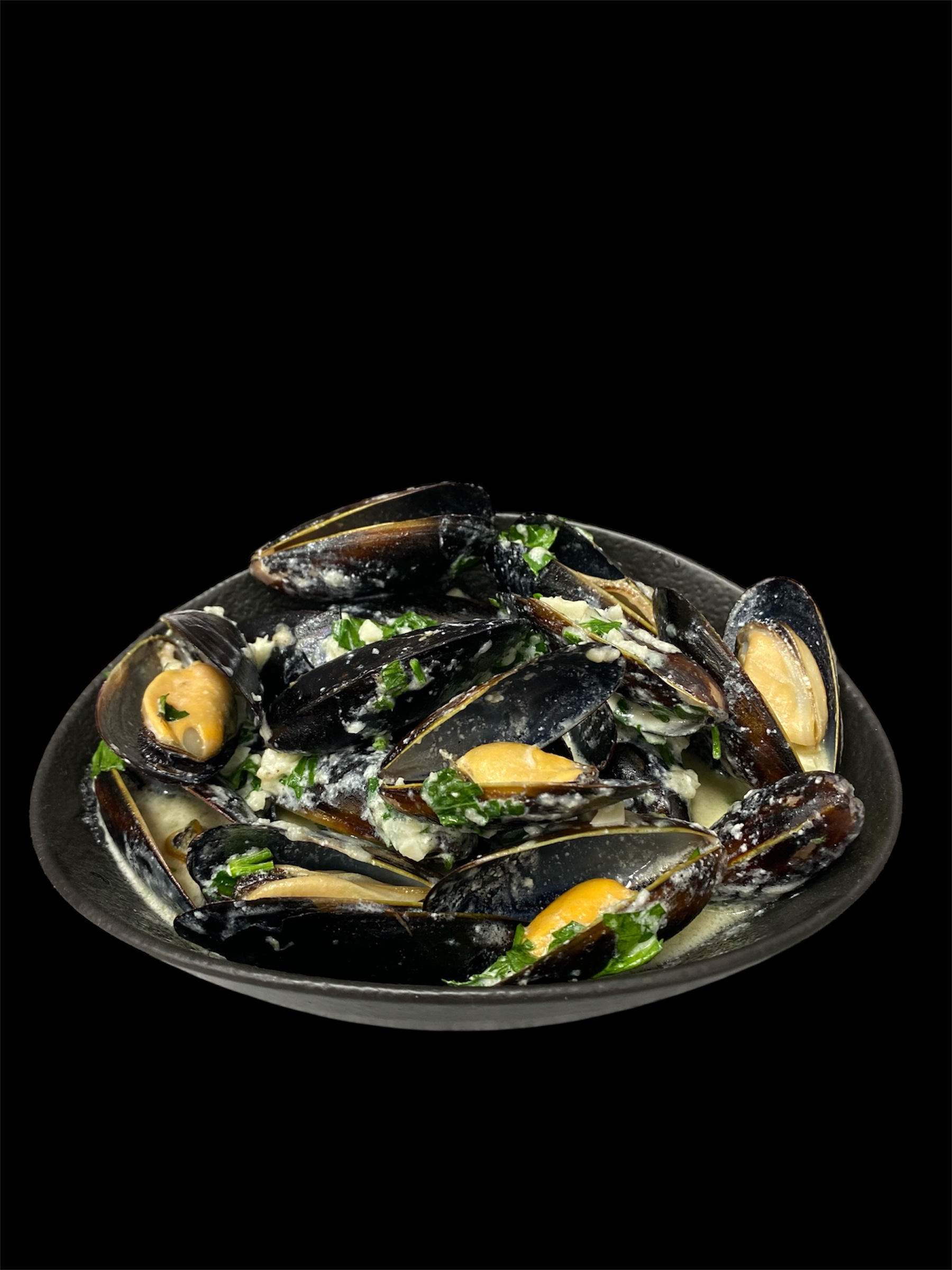 Мидии,чеснок, сливочное масло, сливки, сыр дорблю, петрушка